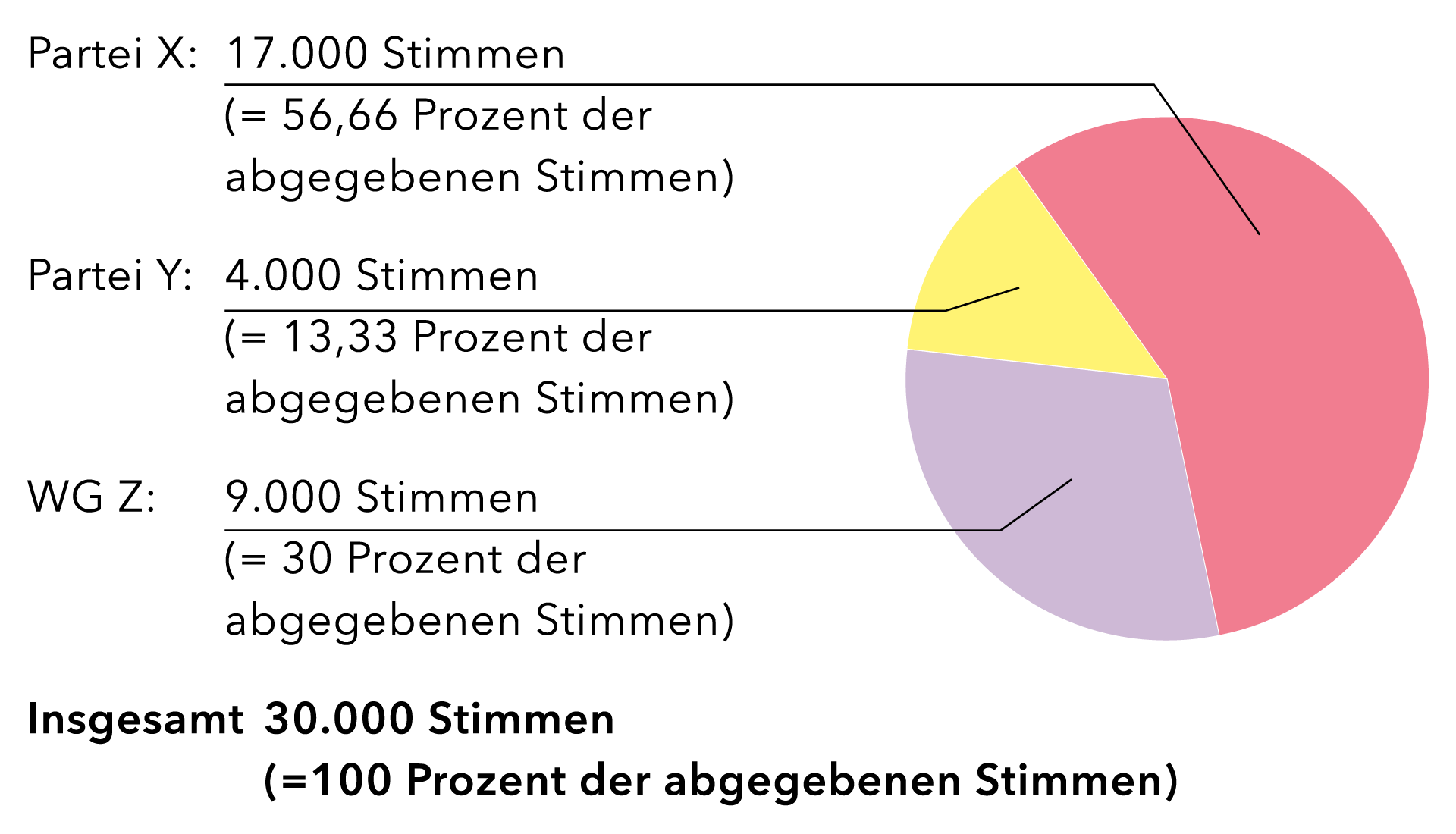 In einer kleinen Gemeinde werden 15 Mitglieder der Gemeindevertretung gewählt. 2.000 Wahlberechtigte stimmen ab und haben jeweils 15 Stimmen. Es werden also 30.000 Stimmen vergeben. Es haben drei Listen kandidiert: Partei X, Partei Y und Wählergruppe Z. Die 30.000 Stimmen haben sich wie folgt auf diese verteilt: