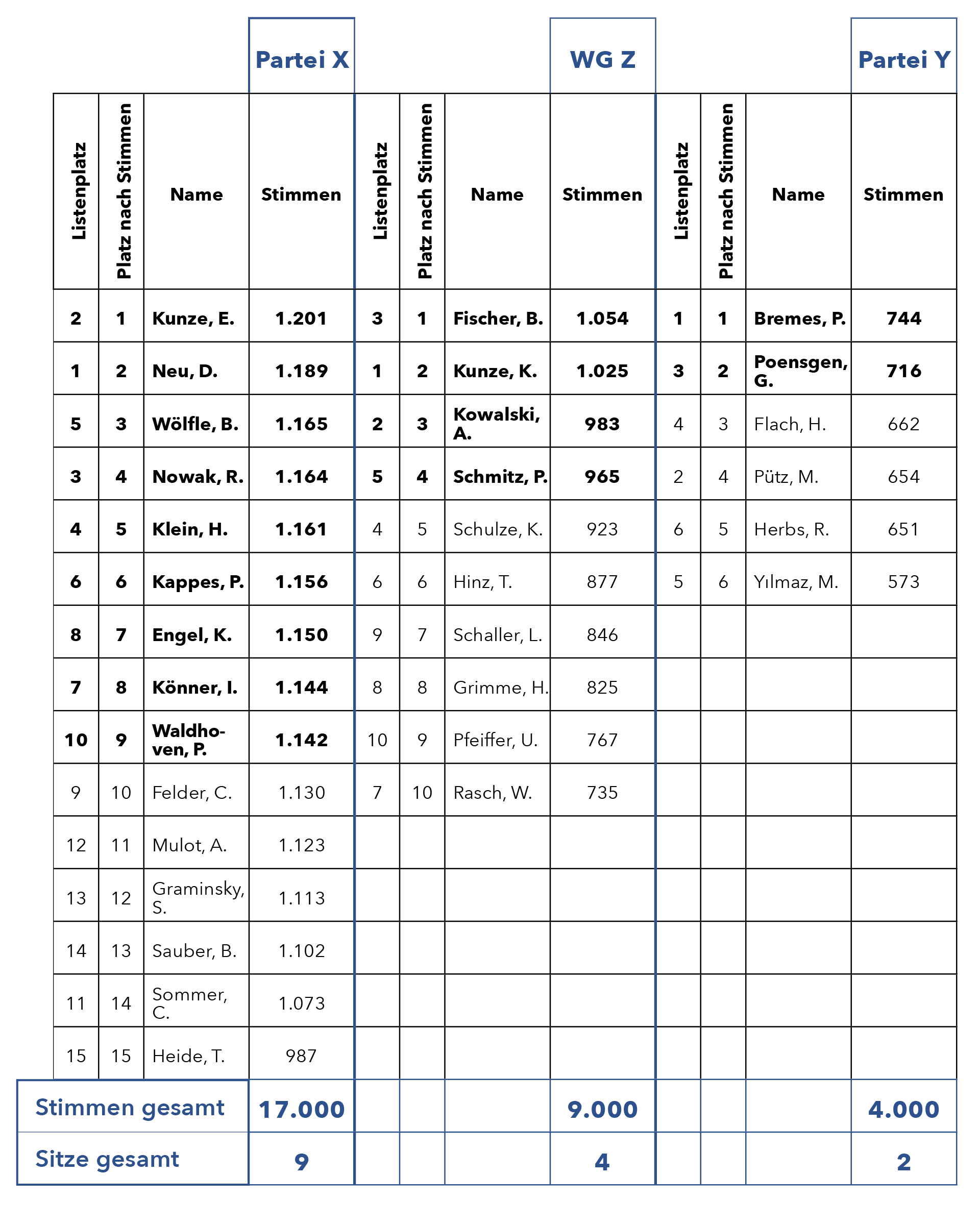 Welche Kandidierenden ein Mandat bekommen, bestimmt sich nun durch deren persönliches Stimmergebnis. Die Personen einer Liste werden nach ihren Stimmenergebnissen in eine absteigende Reihenfolge gebracht. Wer die meisten Stimmen gewonnen hat, ist auf Platz 1 der Liste, danach kommt die Person mit dem zweitbesten Ergebnis usw. Ein Mandat erhalten so viele Kandidierende, wie ihrer Partei oder Wählergruppe insgesamt Sitze zustehen. Beispiel: Hat eine Partei zwei Sitze gewonnen, bekommen die Personen mit den erst- und zweitbesten Ergebnissen ein Mandat.