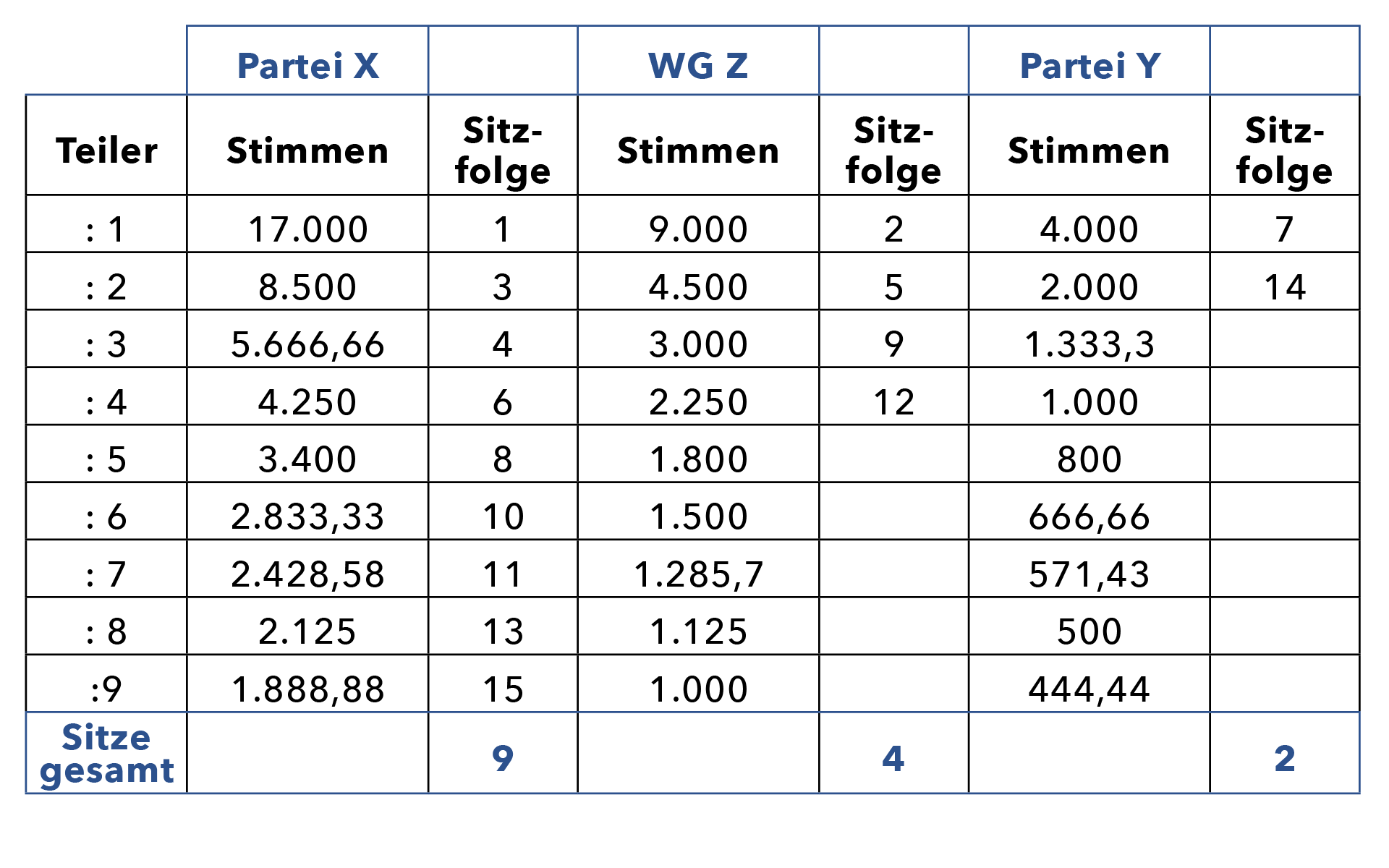 Die Stimmenzahl jeder Partei bzw. Wählergruppe werden nacheinander durch 1, 2, 3 usw. geteilt. So werden sogenannte „Höchstzahlen“ ermittelt. Anschließend bekommen die höchsten Zahlen in absteigender Reihenfolge jeweils einen Sitz zugeteilt, bis alle 15 Sitze verteilt sind. Jedem Wahlvorschlag wird dabei der Reihe nach so oft ein Sitz zugeteilt, wie er jeweils die nächst höchste Zahl aufweist. Wenn auf mehrere Parteien/Wählergruppen die gleichen Höchstzahlen entfallen, bekommt jede jeweils einen Sitz dafür.